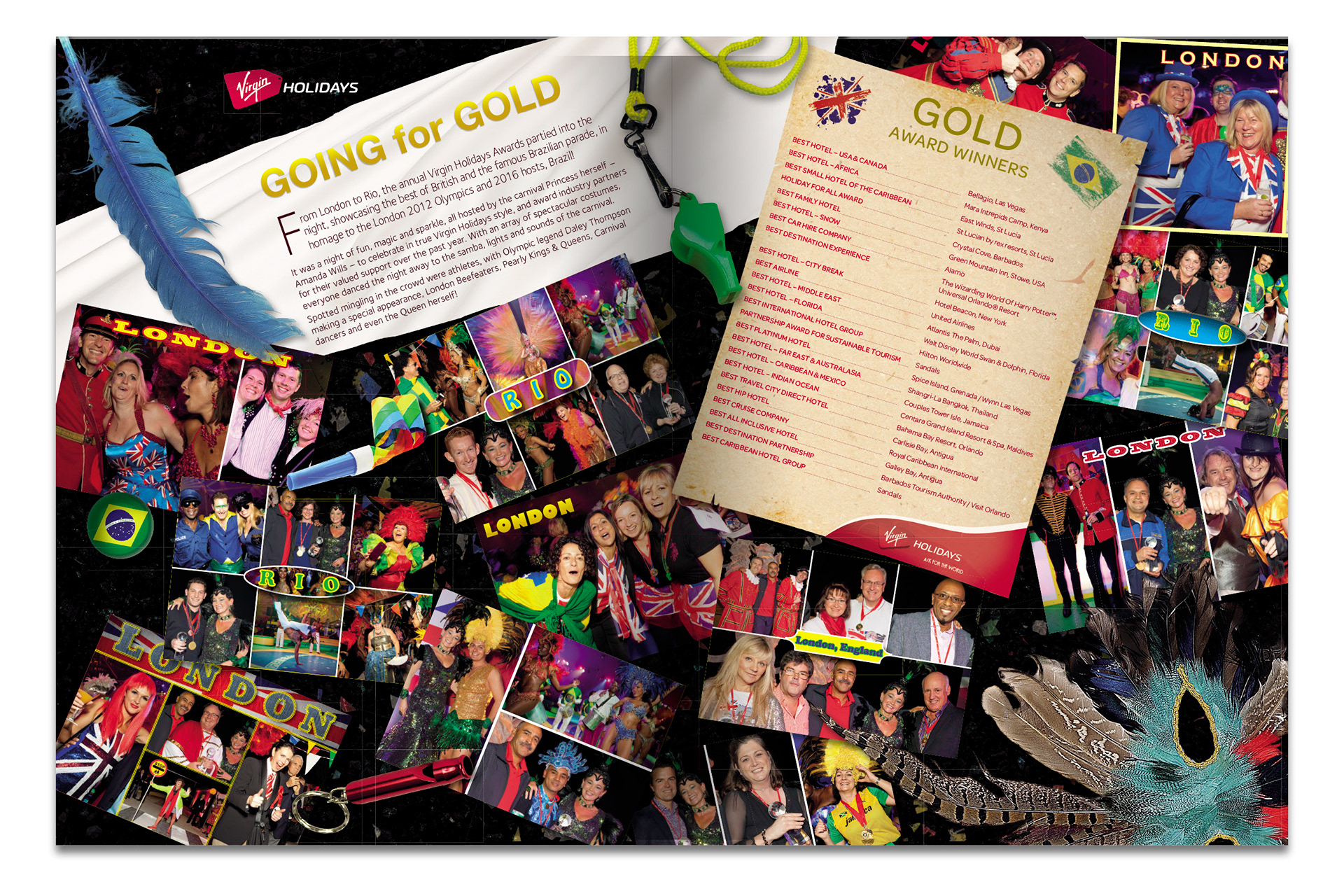 Magazine layouts for coverage of annual Virgin Holidays Awards event for Travel Weekly and Travel Trade Gazette